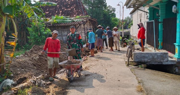 DEMAK - Babinsa Desa Karangsono Koramil 12/Mranggen Kodim 0716/Demak Sertu Ahmad Muslih menunjukkan dedikasinya dengan melaksanakan kerja bakti bersama warga masyarakat Desa Karangsono, Kecamatan Mranggen, Kabupaten Demak, Jumat (24/04/2026). Kegiatan tersebut berupa pengurukan jalan sawah yang menjadi akses jalan menuju ke lahan persawahan warga, guna memudahkan akses petani membawa pupuk dan hasil panennya dengan diangkut menggunakan kendaraan roda empat maupun dua.