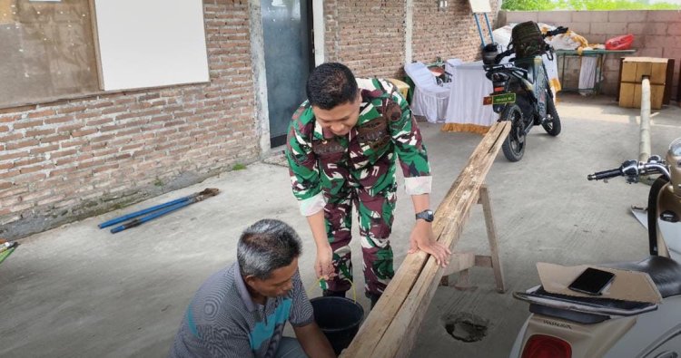 DEMAK - Anggota Koramil 05/Mijen Kodim 0716/Demak Serda Makuwan melakukan monitoring sekaligus turun langsung membantu pembangunan Koperasi Merah Putih (KDMP) yang terletak di Desa Geneng Kecamatan Mijen, Rabu (26/11/2025).
