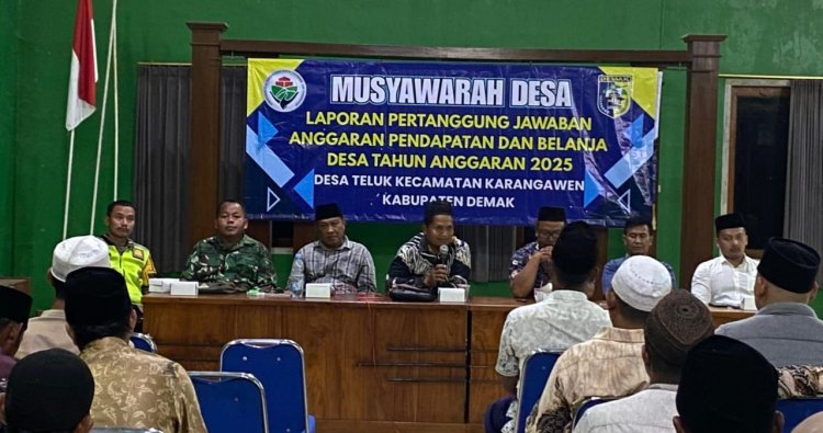 DEMAK - Babinsa Desa Teluk Jajaran Kodim 0716/Demak Serka Bambang P menghadiri Musyawarah Desa (Musdes) penetapan Peraturan Desa tentang Anggaran Pendapatan dan Belanja Desa (APBDes) Tahun Anggaran 2026 yang digelar di Gor Desa Teluk, Kecamatan Karangawen, Rabu (31/12/2025)