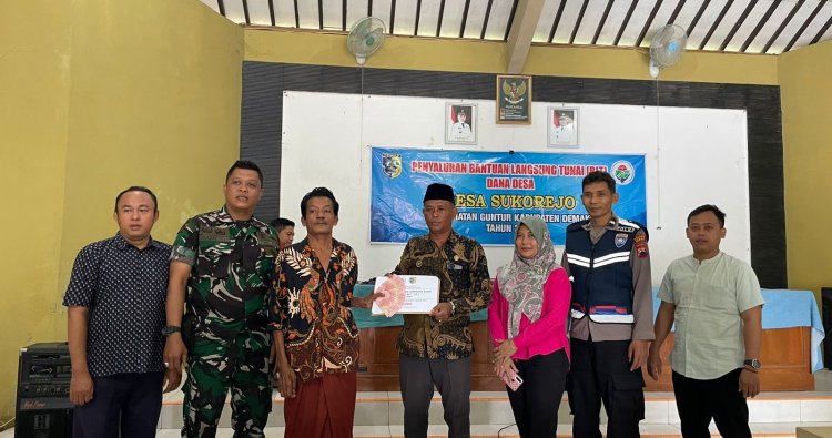 Babinsa Desa Sujorejo Koramil 10/Guntur Serda Harmono mendampingi secara langsung penyaluran Bantuan Langsung Tunai Dana Desa (BLT-DD) bulan September, Oktober, November 2025, di Aula Kantor Desa Sukorejo Kec. Guntur Kab. Demak. Jumat (14/11/2025).