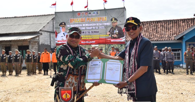 DEMAK - Komandan Kodim 0716/Demak Letkol Arm Dony Romansah, S.Sos., M.Han., secara resmi menutup gelaran program TNI Manunggal Membangun Desa (TMMD) Sengkuyung Tahap IV Tahun Anggaran 2025, dengan upacara penutupan di Desa Surodadi, Kecamatan Sayung, Kabupaten Demak, Kamis (06/11/2025).