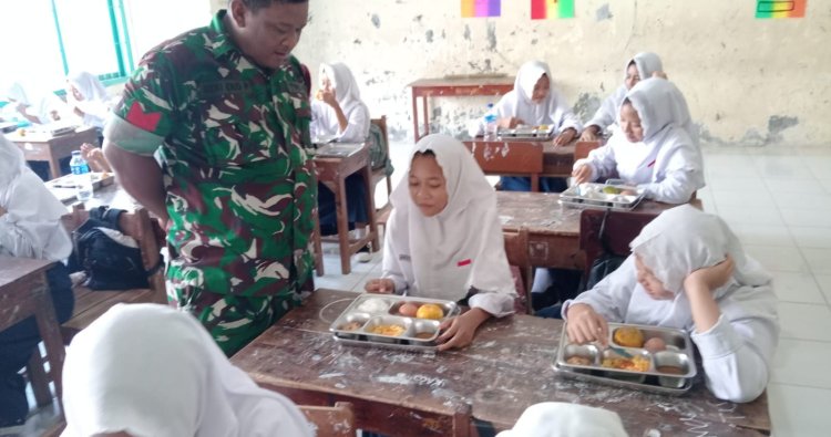 DEMAK - Babinsa Koramil 02/Bonang Kodim 0716/Demak Kopka Heri Eko mendampingi penyaluran program Makan Bergizi Gratis (MBG) untuk anak sekolah di MTS Miftahul Ulum, Desa Weding, Kecamatan Bonang, Kabupaten Demak. Rabu (21/01/2026).