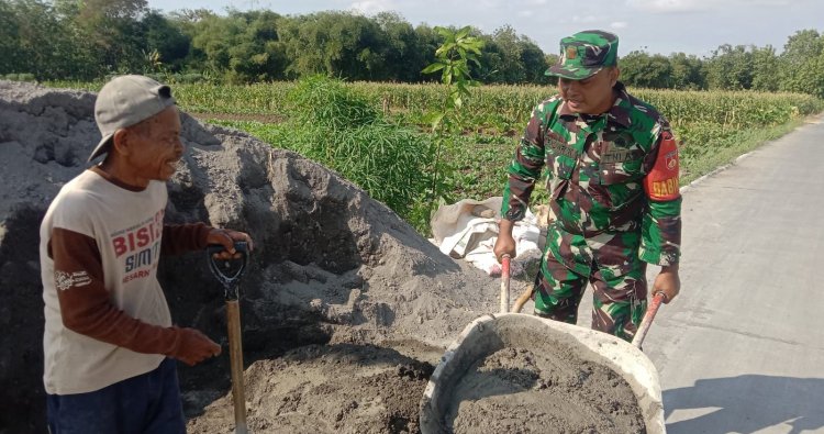 DEMAK - Babinsa Koramil 13/Karangawen Jajaran Kodim 0716/Demak Sertu Fajar bersama warga melaksanakan Karya Bhakti membantu pembuatan talud yang terletak di Dukuh Bengkah Desa Wonosekar Kecamatan Karangawen, Senin (05/01/2025).